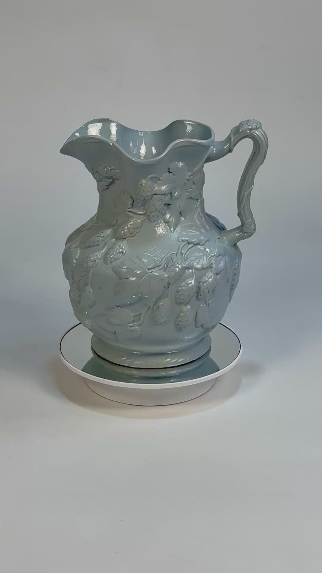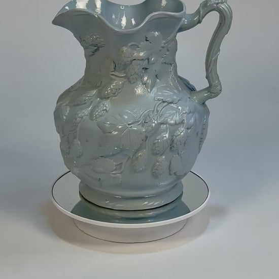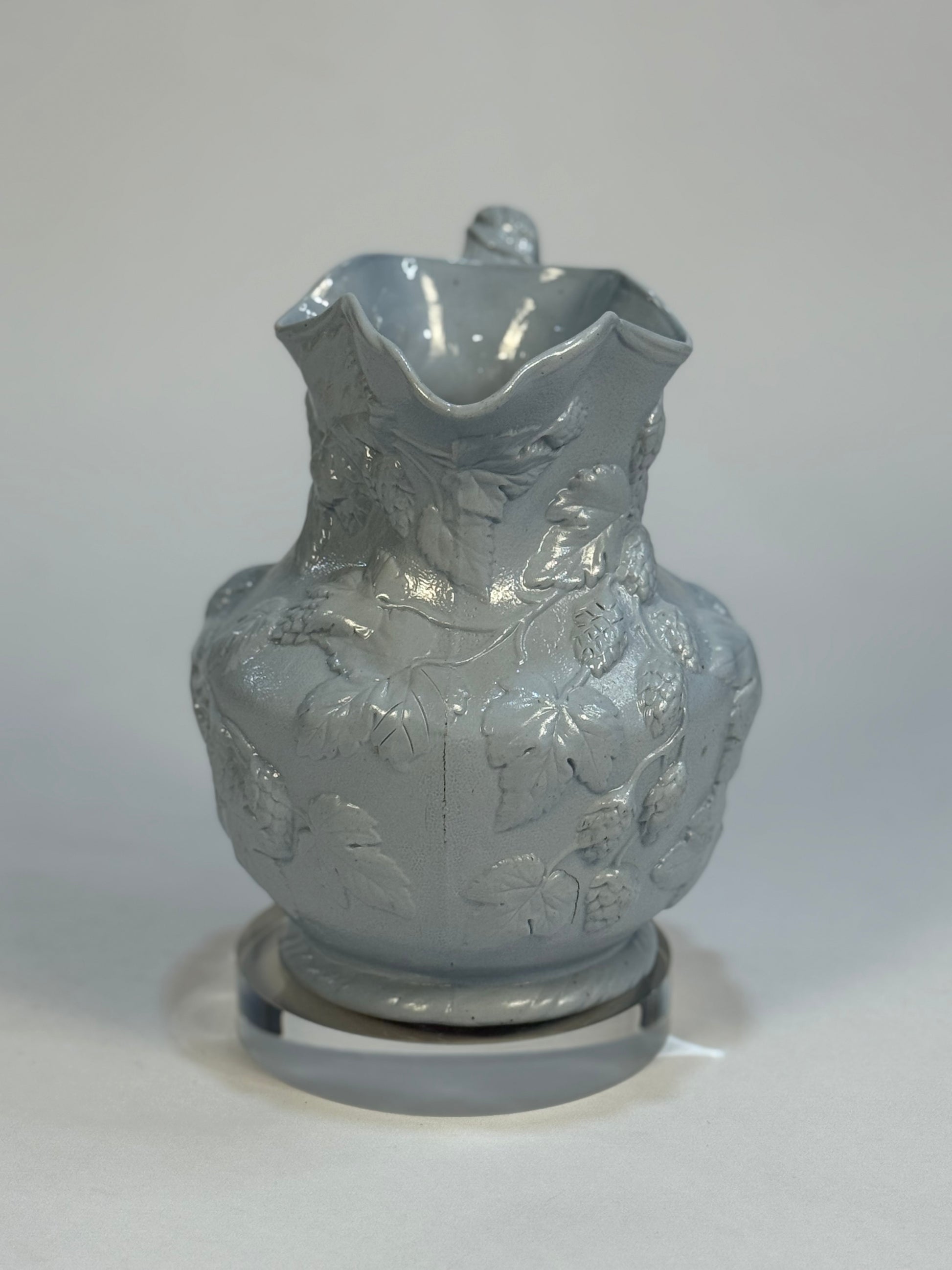 A beautifully detailed 19th-century stoneware pitcher featuring raised reliefs of hop vines and leaves — a classic motif symbolizing abundance and brewing heritage. The piece is marked with the impressed numbers 327 and 4, denoting its mold and size within the production series. Its warm glaze, crisp molding, and balanced proportions reflect the quality craftsmanship of English stoneware from the mid-to-late Victorian era. A fine addition for collectors of antique pottery and decorative ceramics.