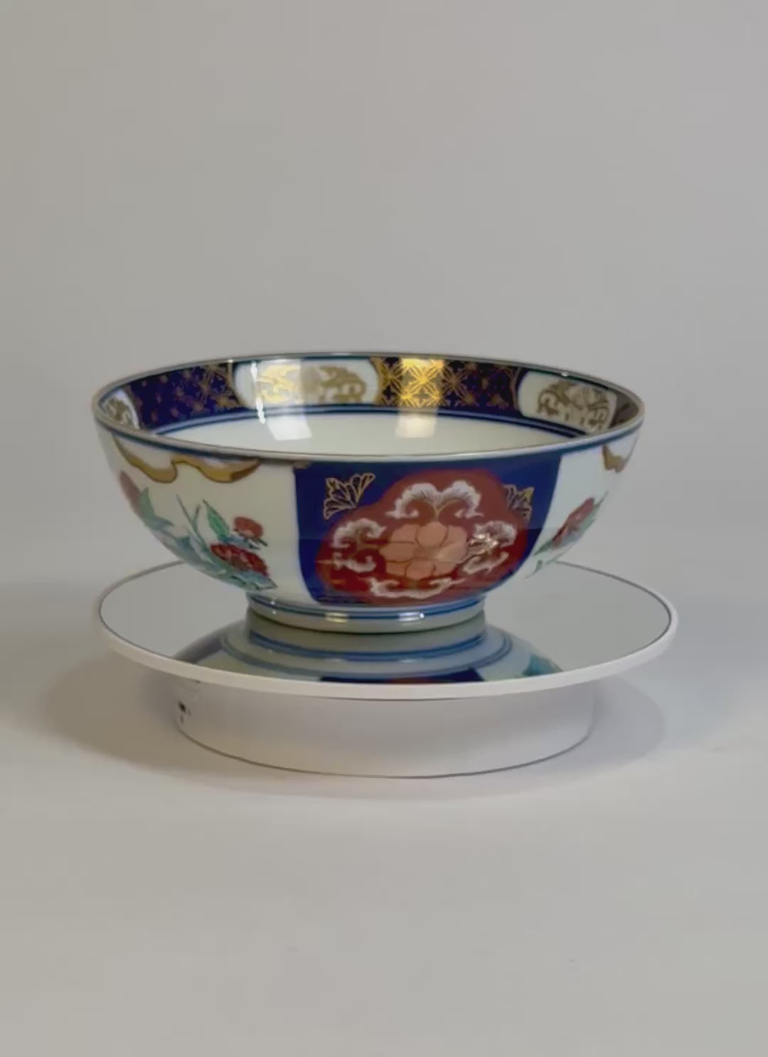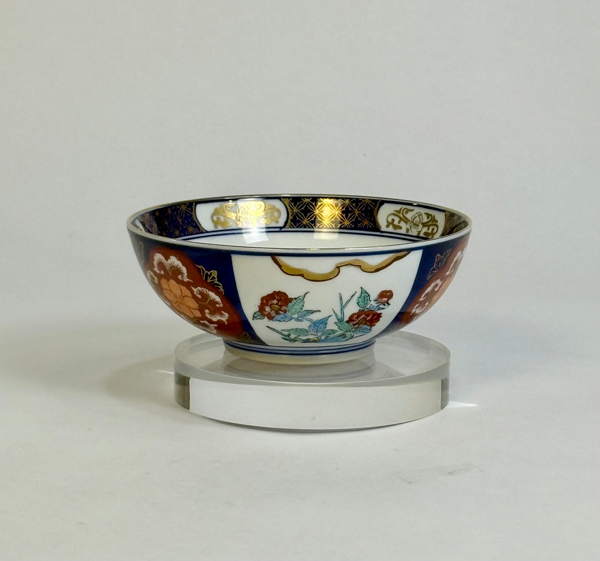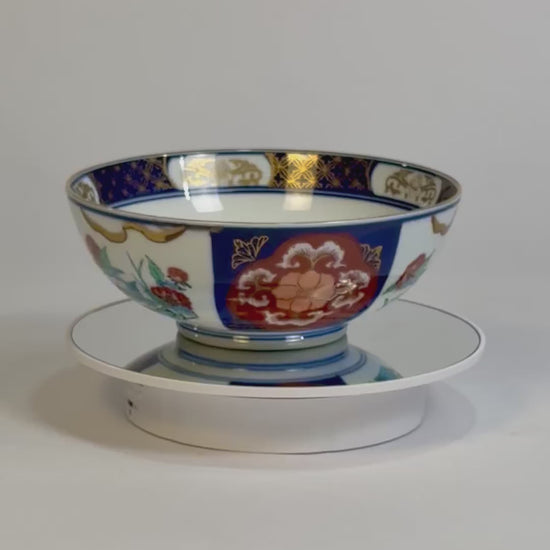 A striking vintage Imari porcelain bowl adorned in the traditional palette of deep cobalt blue, rich iron red, and hand-gilded gold accents. The intricate floral and geometric motifs reflect the refined artistry of Japanese Imari ware, celebrated for its vibrant contrast and balance. Both decorative and functional, this piece exemplifies timeless craftsmanship — an exceptional addition to any collection of Asian ceramics or elegant interior display.