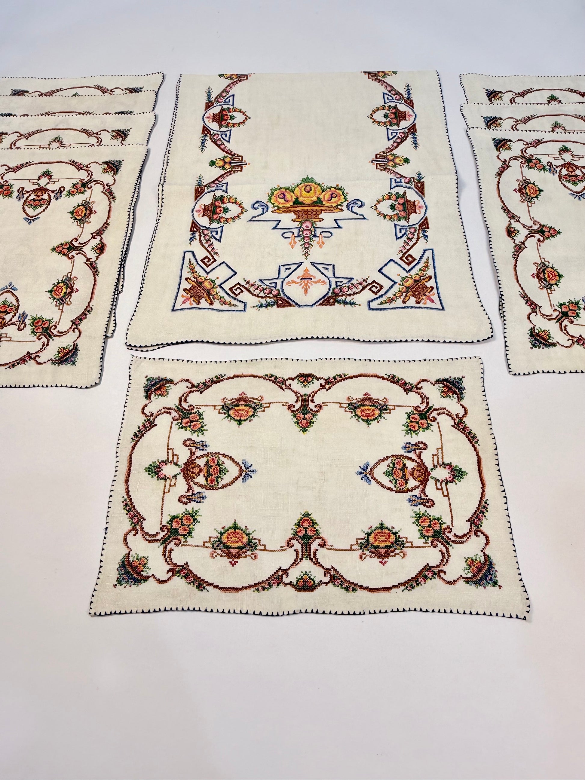 Vintage Hand-Stitched Linen Runner and Placemats with Floral Cross-Stitch