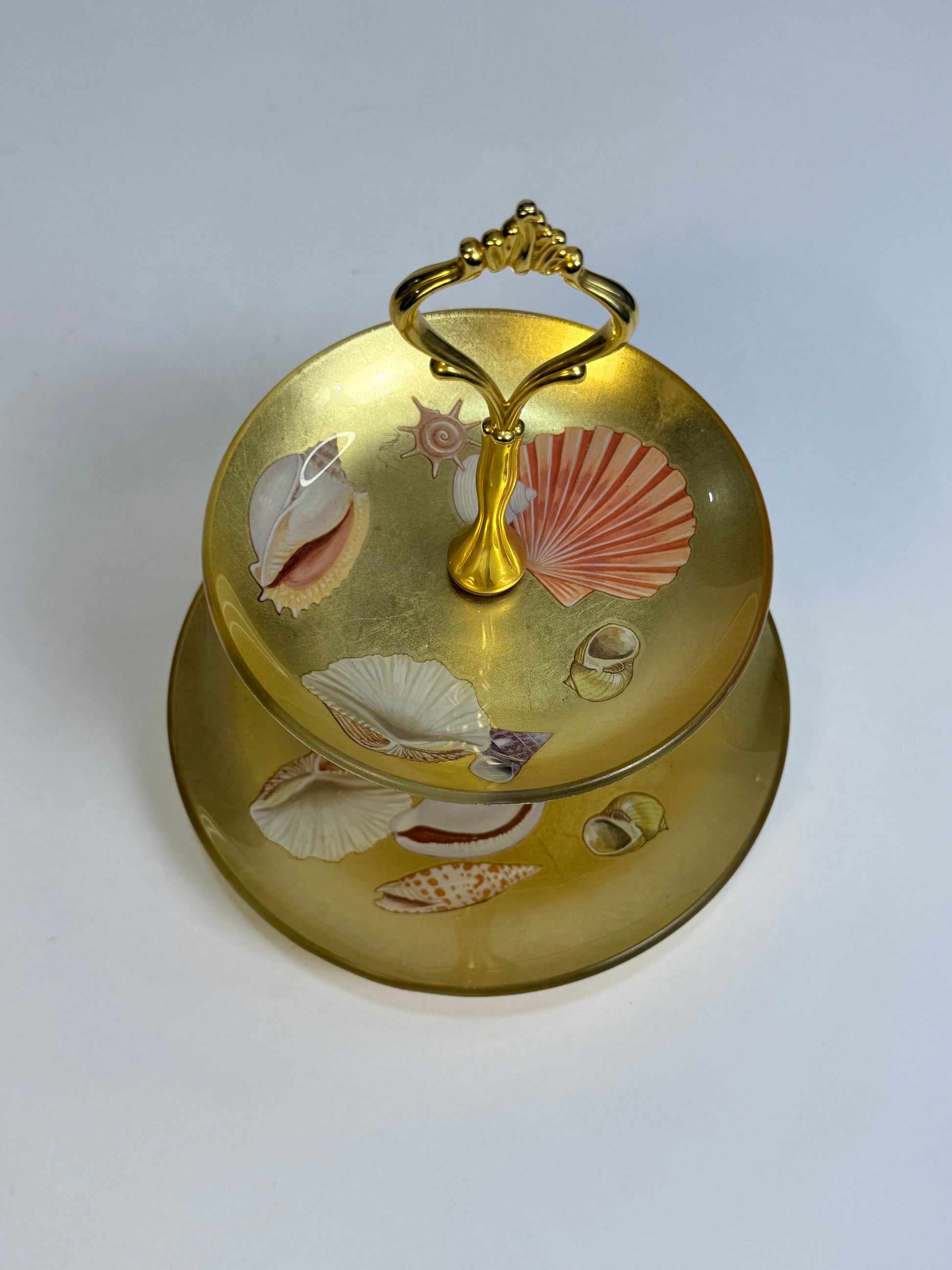 A striking coastal-inspired serving piece featuring two shell-shaped tiers with graceful curves and pearlescent glaze. The tiered design adds height and elegance to any table, perfect for displaying sweets, hors d’oeuvres, or jewelry. Likely mid-century in origin, it blends functional design with sculptural beauty — a collectible piece for lovers of vintage coastal décor or seaside entertaining.