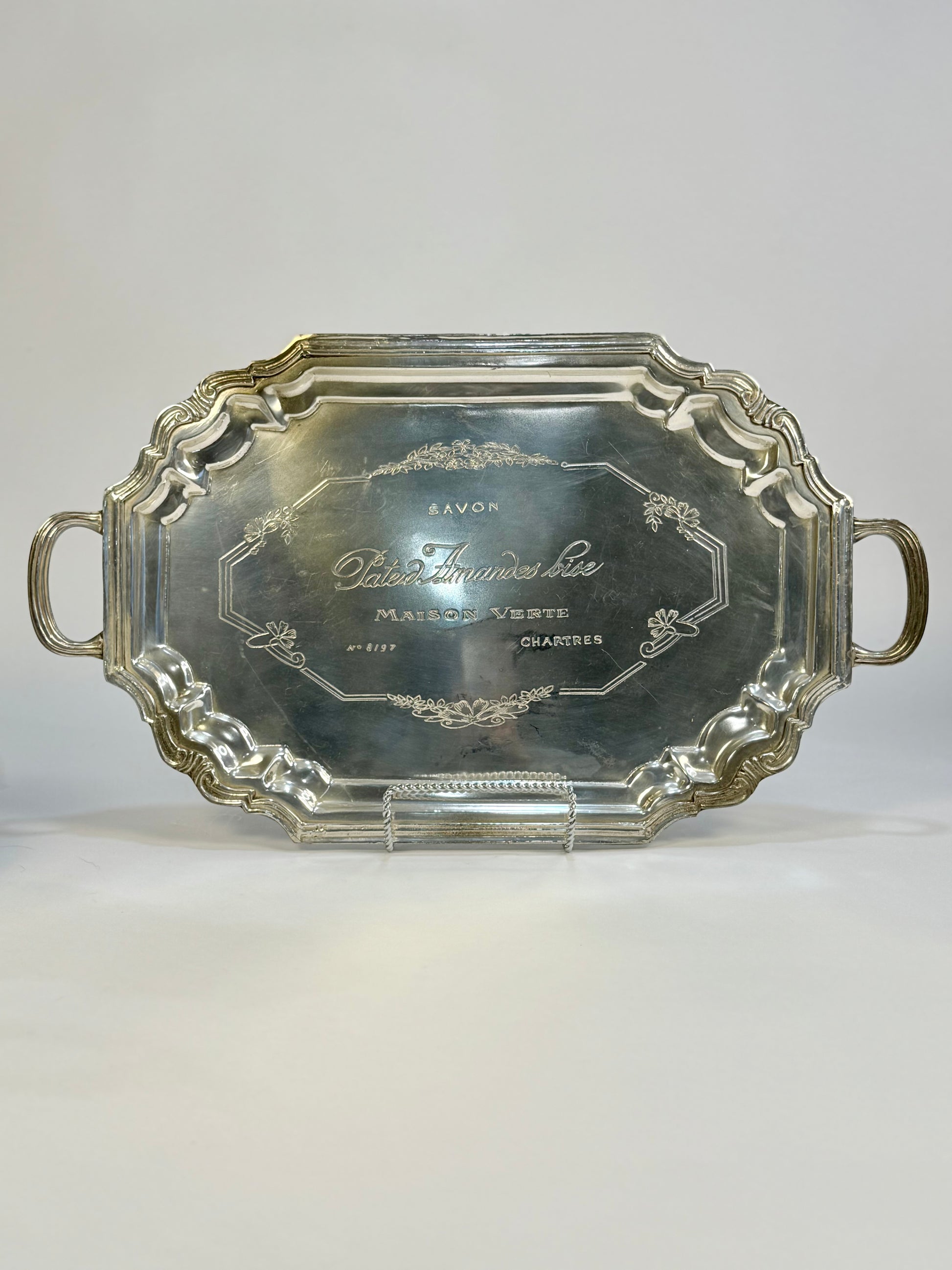 A rare French advertising tray promoting Pâte d’Amandes Lise soap from Maison Verte in Chartres, France. Silver-plated with embossed lettering and delicate scrollwork, this early 20th-century piece captures the elegance of Belle Époque commercial design. Once used for in-store display or product presentation, it now serves as a striking collectible that bridges the worlds of advertising ephemera and fine decorative metalwork.